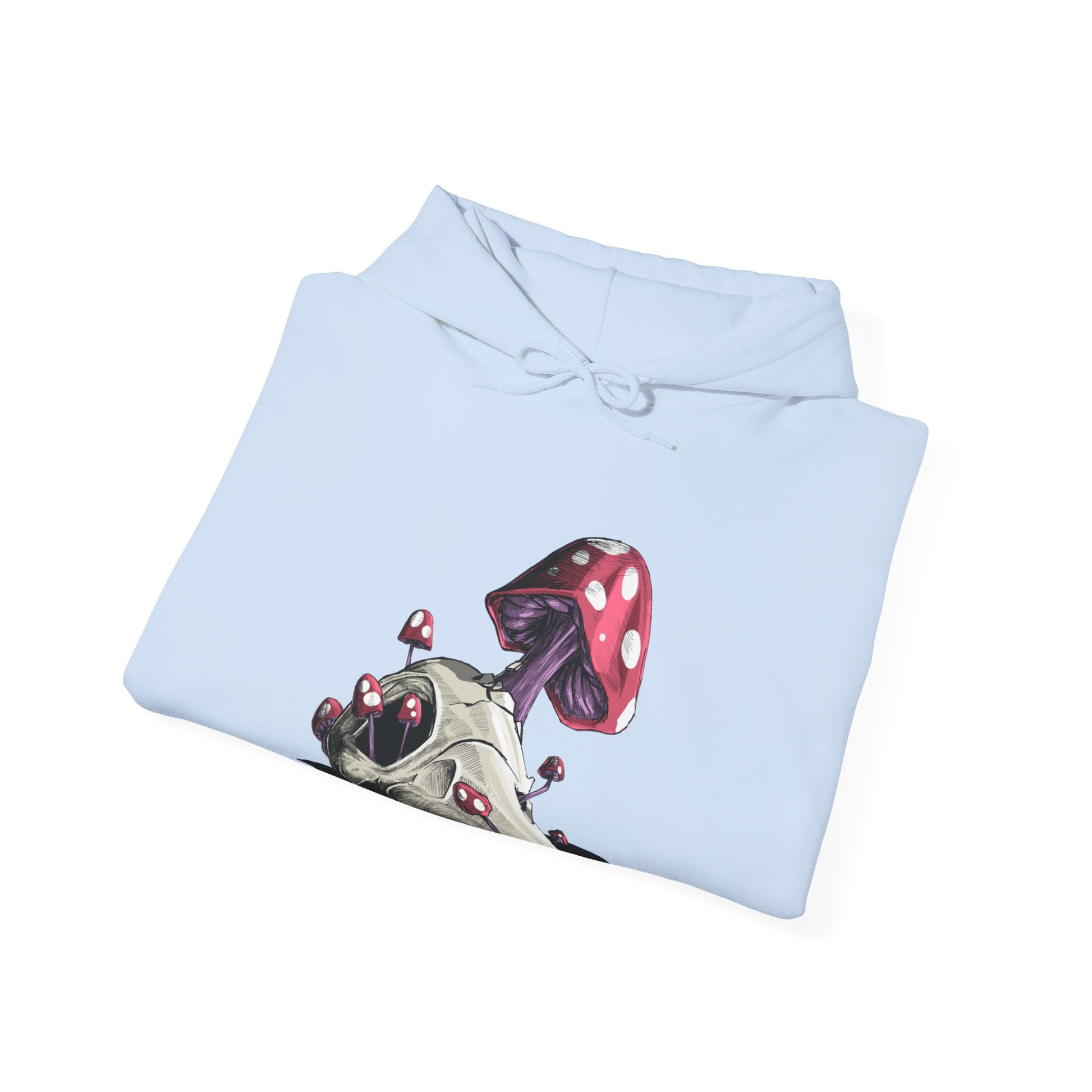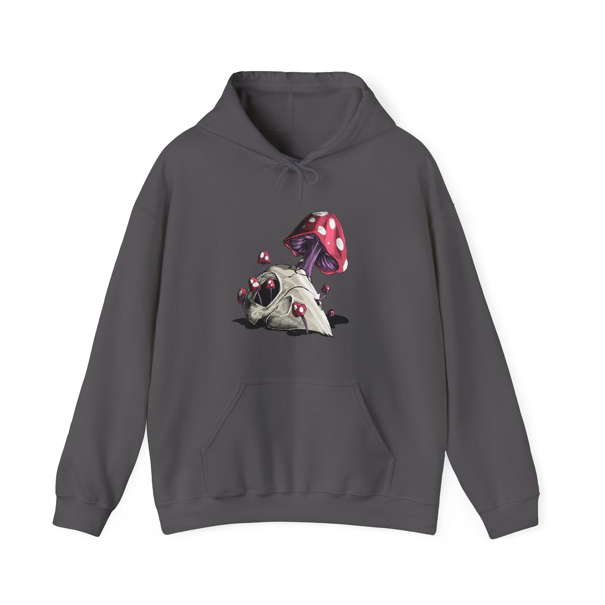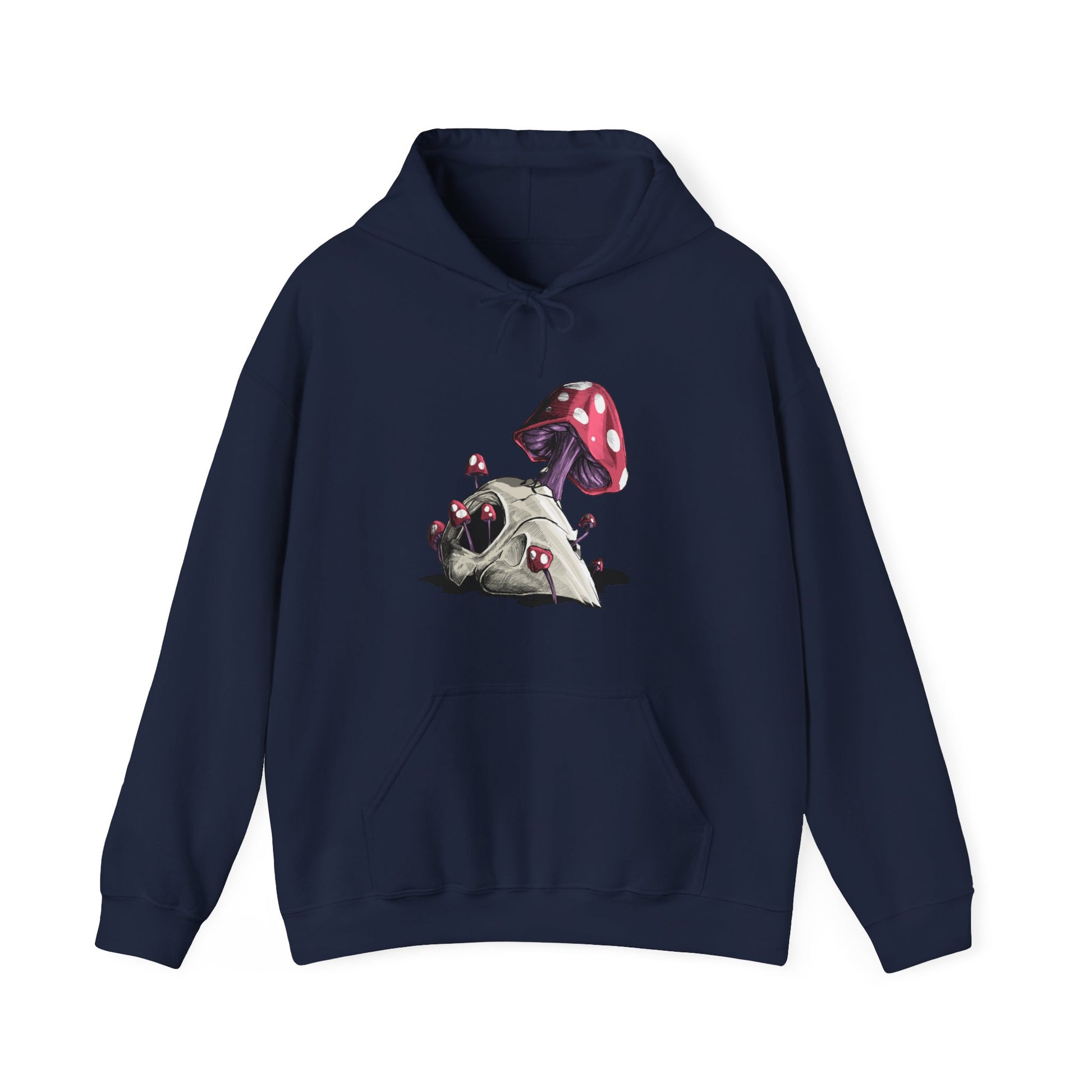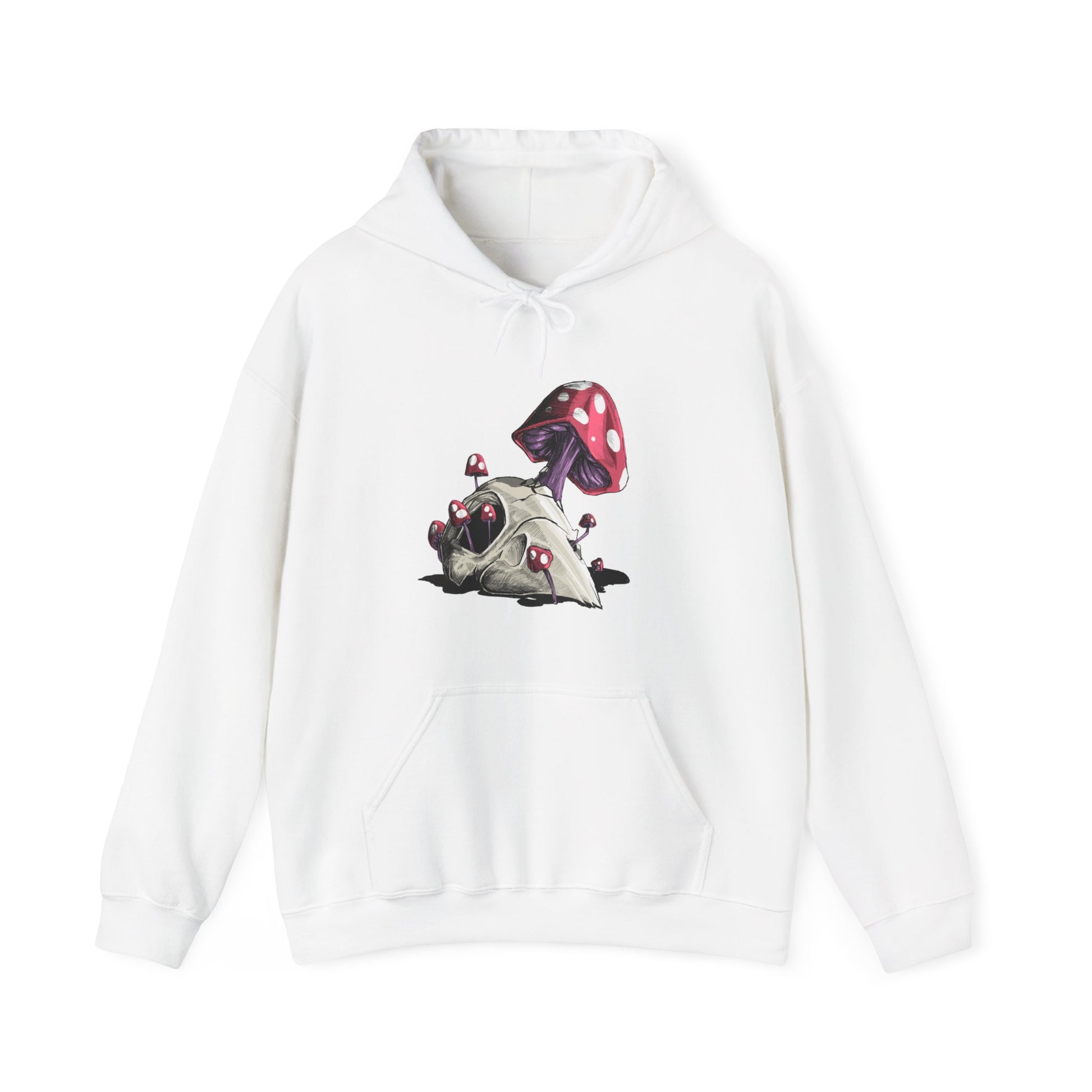 Digitally hand-drawn and printed on unisex heavy blend hoodies, The Mushroom Skull is a simple design which can symbolize a cycle of sorts. Is it the macabre nature of life? Or is it our own mind, as some of our most beautiful thoughts give way to the darker ones.