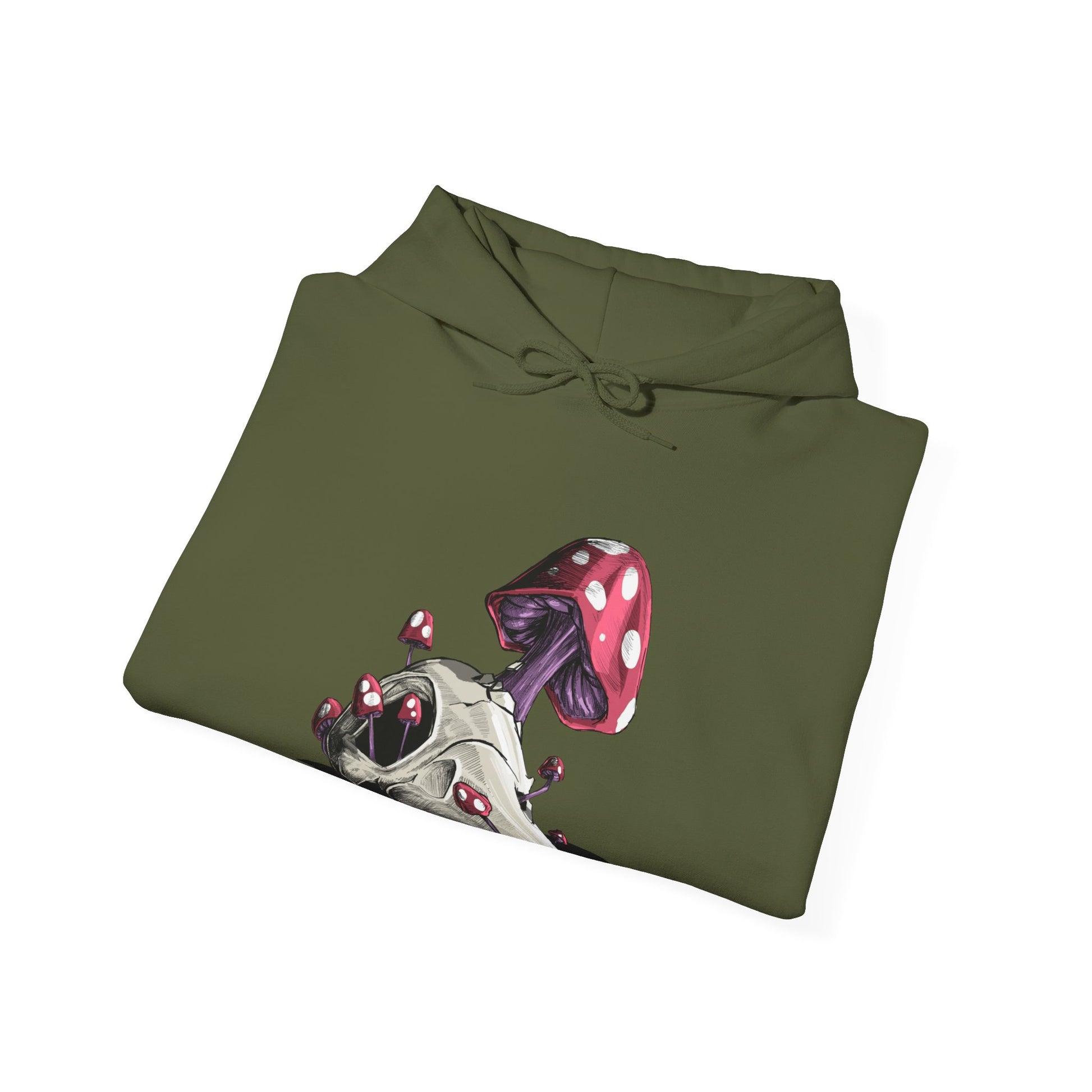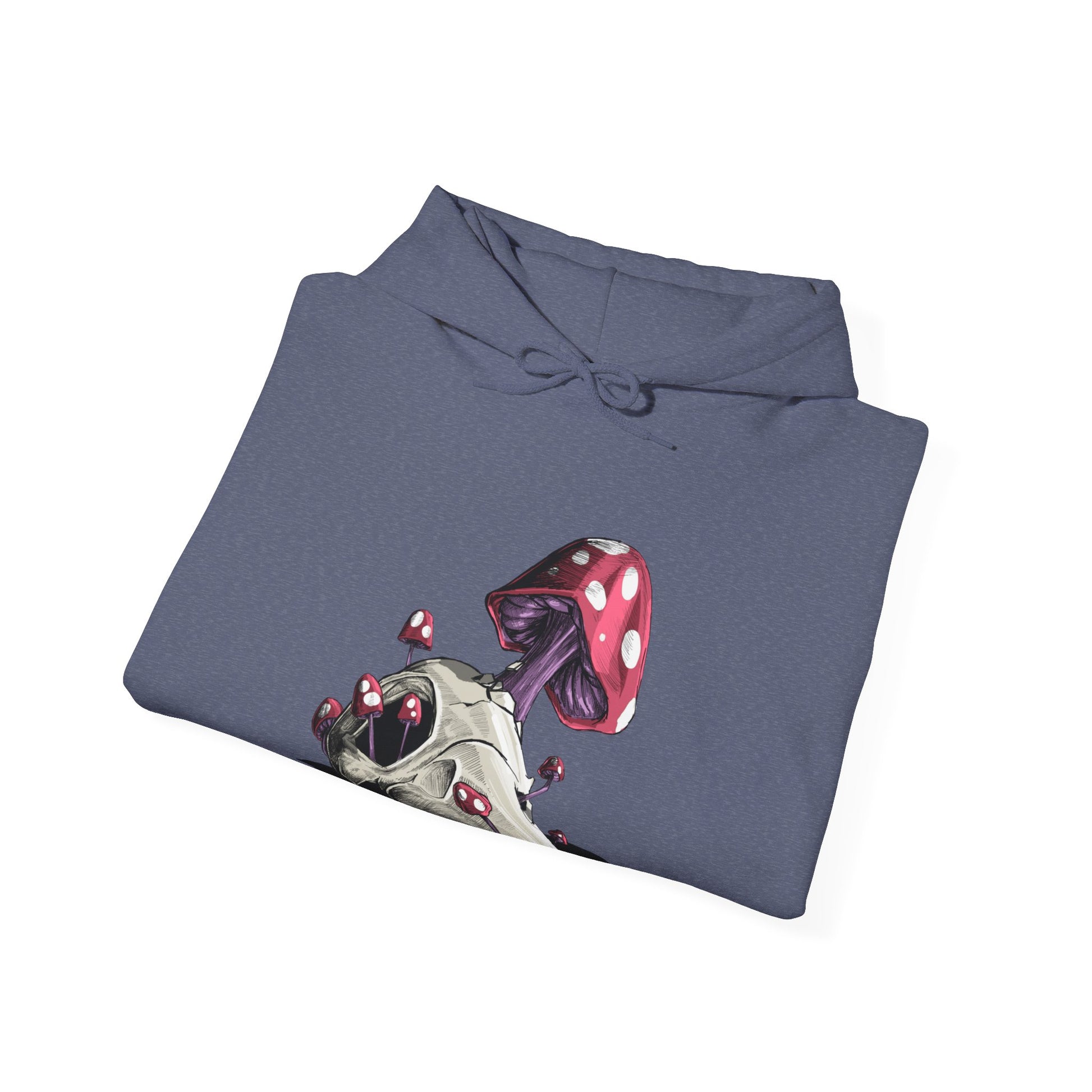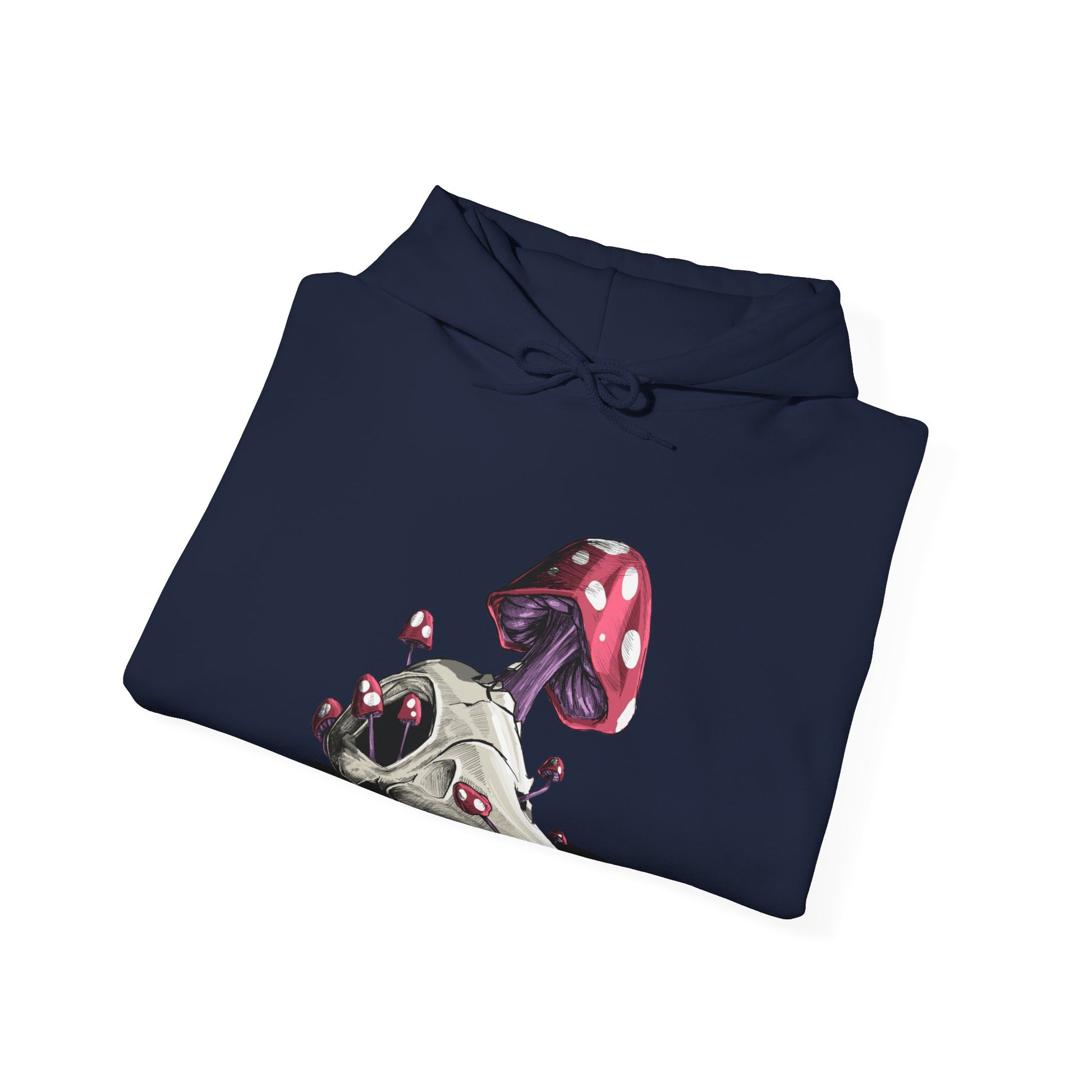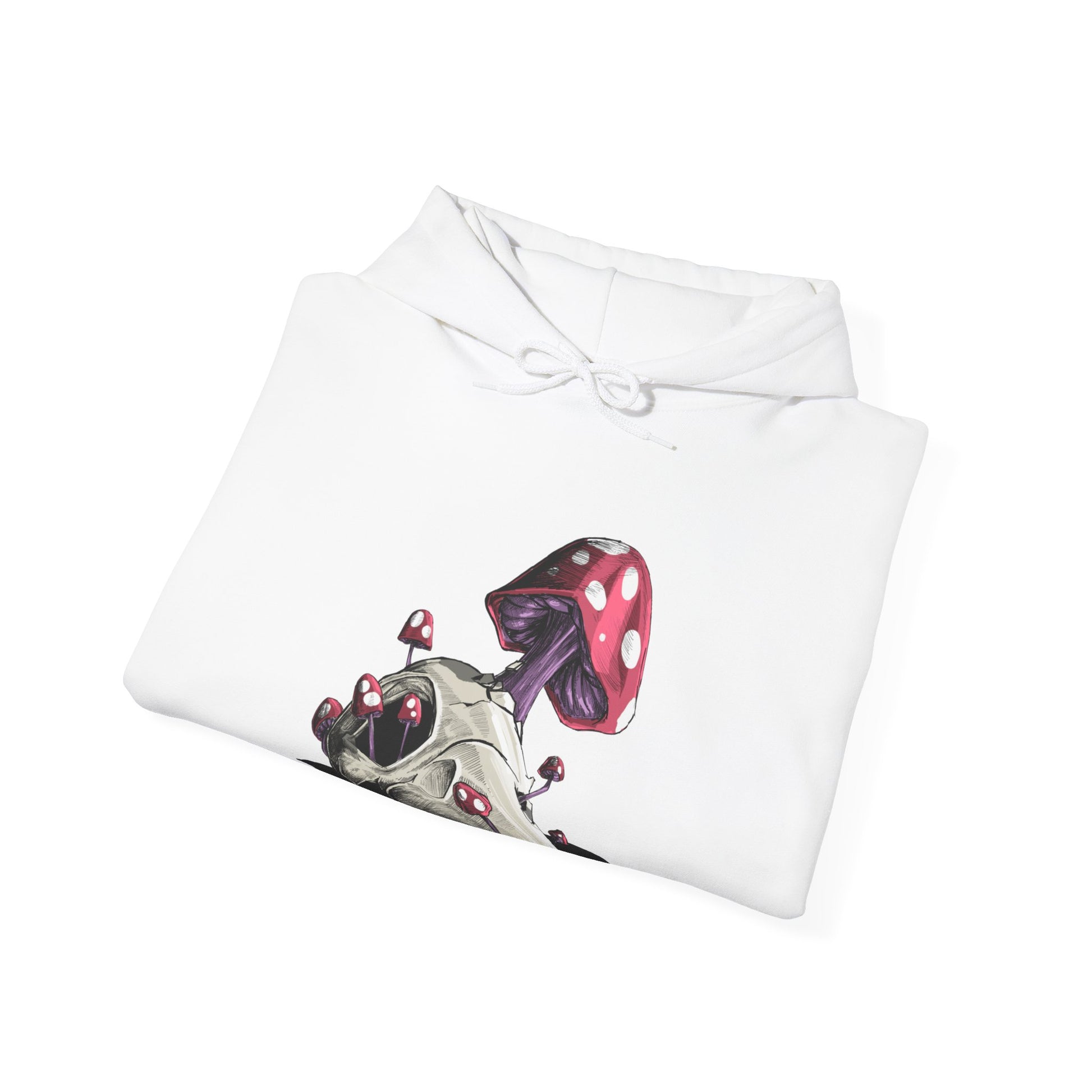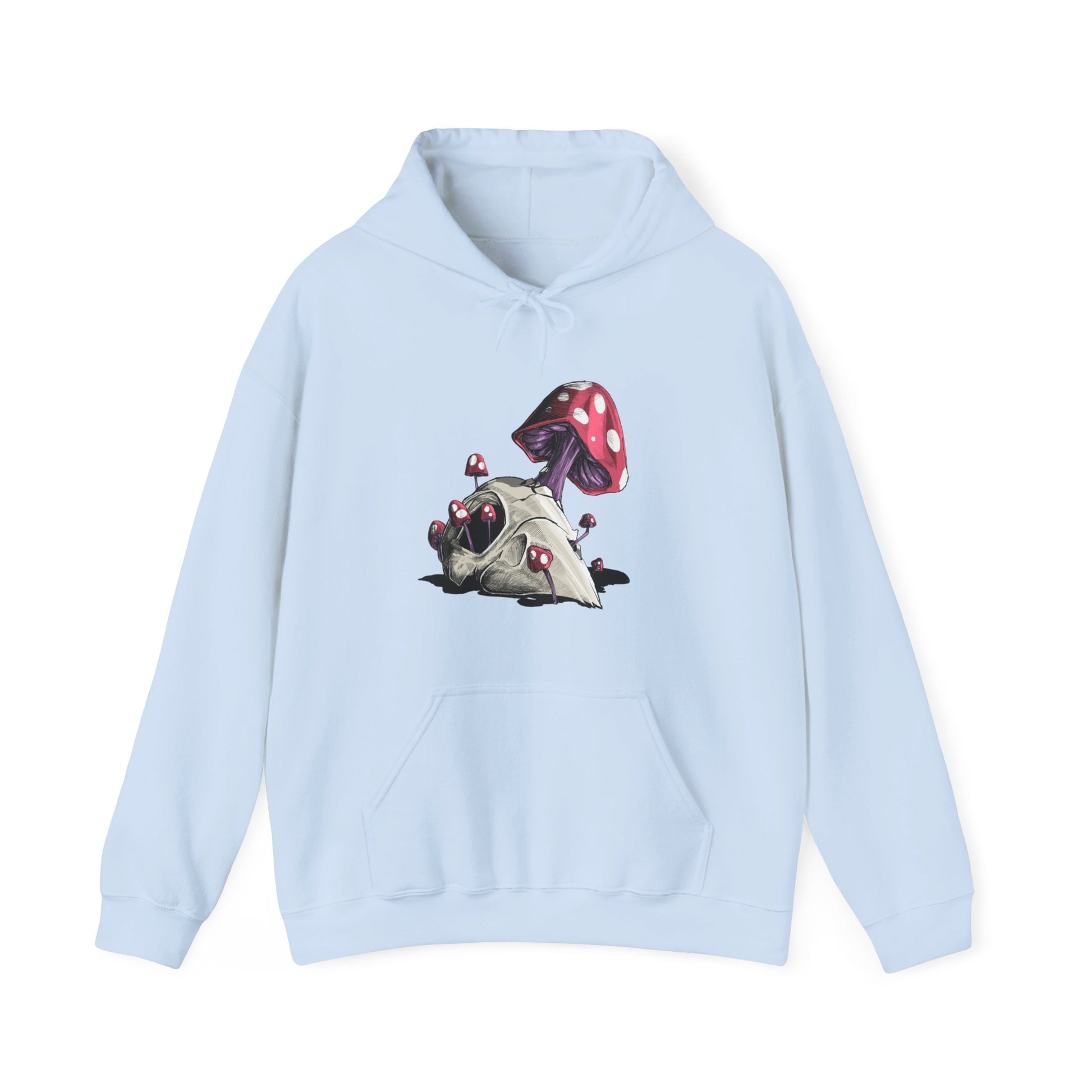 Digitally hand-drawn and printed on unisex heavy blend hoodies, The Mushroom Skull is a simple design which can symbolize a cycle of sorts. Is it the macabre nature of life? Or is it our own mind, as some of our most beautiful thoughts give way to the darker ones.